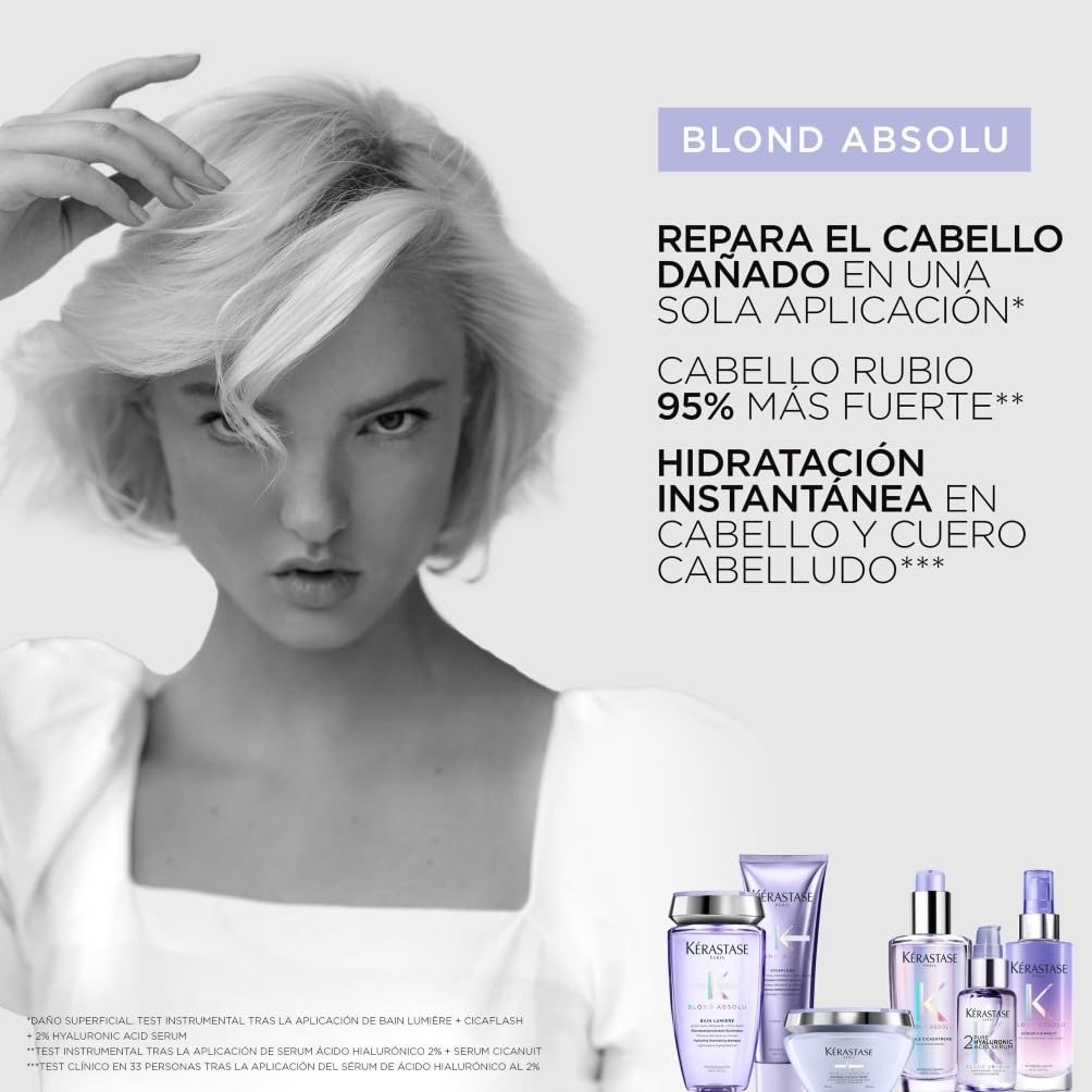 Sérum Cicaplasme de Blond Absolu es un tratamiento sin aclarado protector del calor para cabello rubio con mechas o decolorados. Enriquecido con ácido hialurónico, flor de edelweiss y filtros UV, restaura la fibra dañada, evita la aparición de puntas abiertas y protege el cabello de las agresiones externas