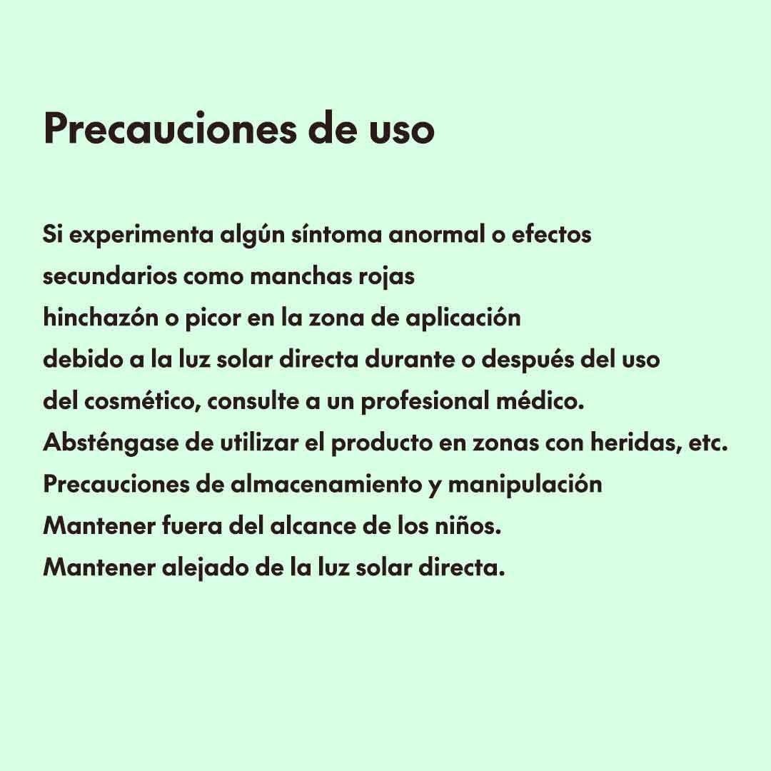 Solo para uso externo. Evitar el contacto con los ojos. / Discontinue use si se rompe, redness, o picar occurs. / Consulte a fisician if irritation persists. / Mantener fuera del alcance de los niños. / Almacenar en un lugar fresco y seco.